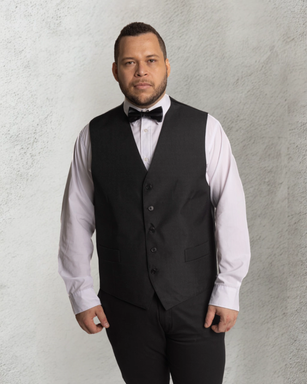 Chaleco slim fit super 100 corte italiano con diseño liso en color negro. Calce entallado. Rasado por detras, cuenta con 2 botones detras a los lados para ajustar al cuerpo. Confeccionado en 65% viscosa y 35% poliester.